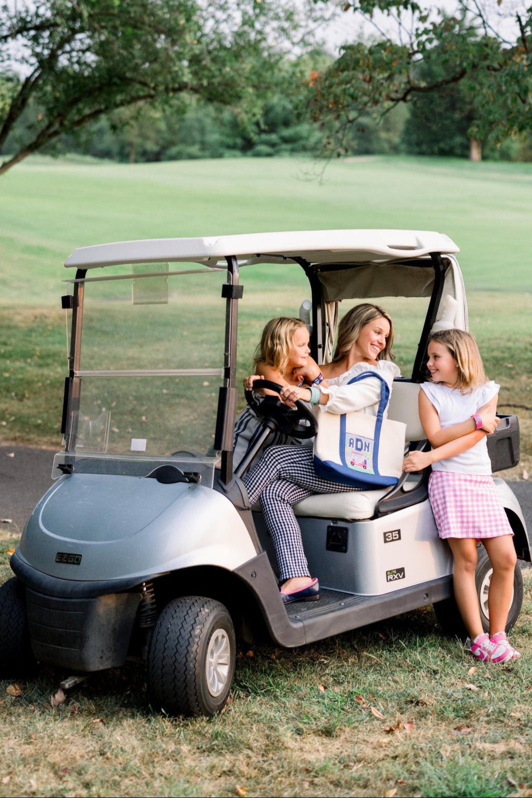 Our carry-all tote bag features lots of room to hold all of your essentials. Perfect for the beach, pool, or just running around town. The sturdy canvas material keeps a nice shape and the front pocket is adorned with an adorable golf scene and any monogram you choose! The inside features a zipper pocket for keys, lip gloss, and loose change.